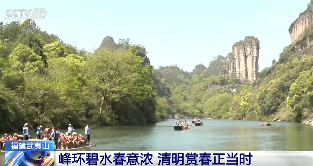 春天的武夷山草木葱茏、绿树成荫,处处欲望勃发。在热点景点九曲溪,游客们登上竹筏泛舟碧波之上,赏玩两岸奇峰,感受“山拥碧水水映峰”的绝好意思气候。