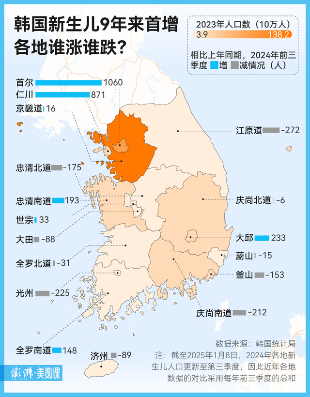 近十年来,除世宗外,韩国 16 个省级区画的壮盛儿数均呈下降趋势。但在 2024 年,首尔、仁川、大邱和忠清南谈等 7 地的壮盛儿较 2023 年完毕了正增长,其中,首尔加多的壮盛儿数最多,2024 年前三季度较往年同时多生 1060 东谈主。
