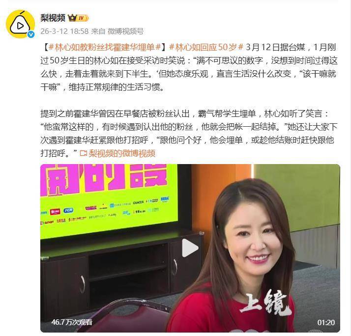 刚过完50岁寿辰的林心如,谈起年齿心态生动,直言“该干嘛就干嘛”,生涯依然。而聊到丈夫霍建华,她则笑着共享起他的“买单风气”。蓝本,霍建华私行碰到认出他的粉丝时,时常会顺遂把对方的账一说念结掉,尤其是当对方能叫出他名字的时辰。林心如显露,像之前在早餐店帮学生粉丝支付简短200元餐费这种事,“蛮常发生”,俨然已成这位“老干部”立场明星的牌号当作。
