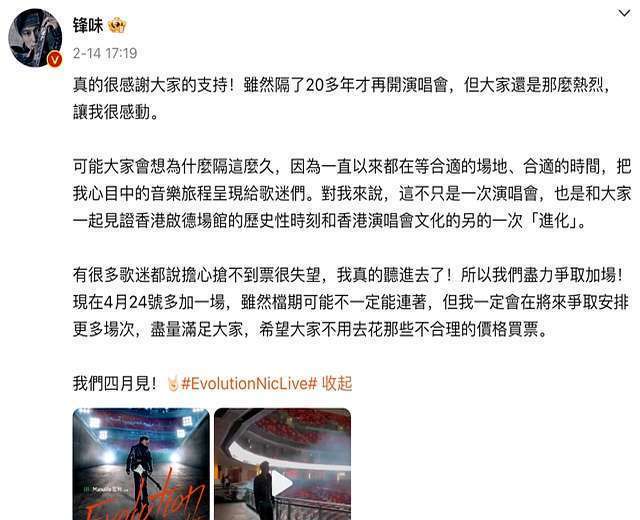 对了,4月23日,谢霆锋还在他的个东说念主微博“锋味”上,公布了此次香港“进化”演唱会的歌单,一下子就蛊惑了超多关切。歌单以粤语经典为主,涵盖了他音乐糊口中各个本领的代表作,还加入了调动的互动缱绻。像《揣测空幻》《一了百了》《玉蝴蝶》《坏习尚》《因为爱是以爱》《黄种东说念主》这些歌,皆在歌单里。
