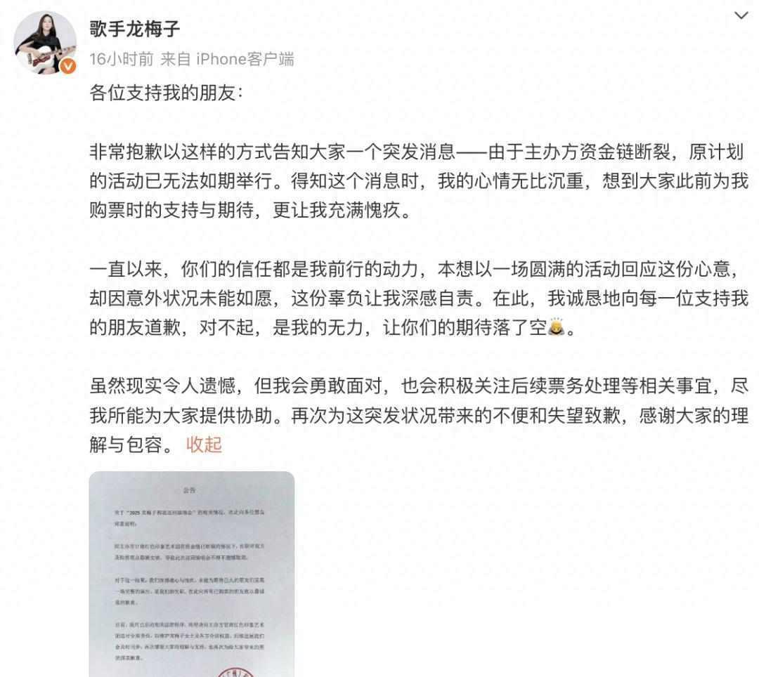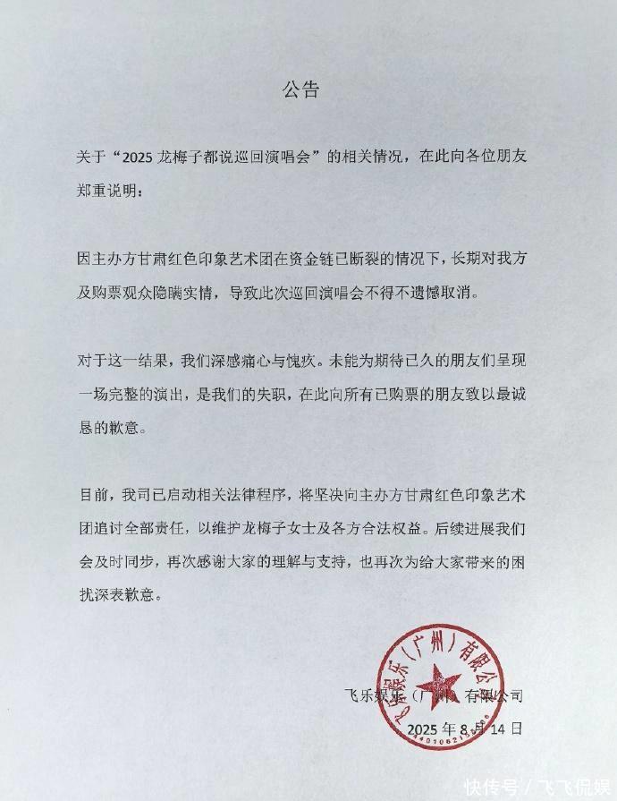 8月14日,歌手龙梅子在应付平台发视频谈歉,称原定举办的演唱会因专揽方甘肃红色印象艺术团资金断裂被动取消。她表露团队已准备服装、彩排,但专揽方拖欠情势费、安保费等,连舞台齐没搭好,距离献技只剩两天。