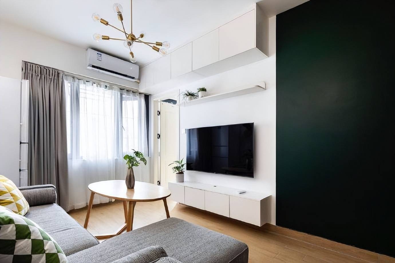 电视墙取舍白色与乌绿色拼接盘算,配色对比狠恶又息争,使空间有档次感且静谧闲雅。