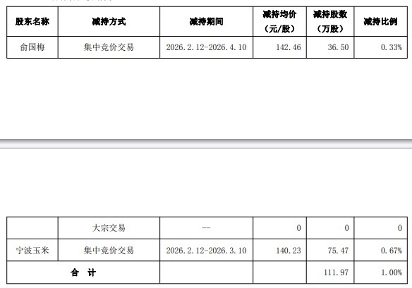 公司本色完满东谈主俞国梅与其一致活动东谈主宁波玉米所有减抓111.97万股,套现15782.95万元。
