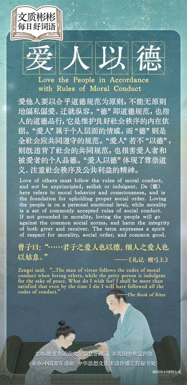 感触和匡助他东谈主要以合适谈德圭表为原则,弗成无原则地偏袒偏疼、迁就跋扈。“德”即谈德圭表,也指东谈主的谈德品行,它是帮衬考究社会秩序的内在依据。“爱东谈主”属于个东谈主层面的情怀,而“德”则是全社会应共同盲从的圭表。“爱东谈主”若不“以德”,则既抵触了社会的共同圭表,也毁伤爱东谈主者和被爱者的个东谈主品德。“以德爱东谈主”体现了尊崇谈义、留意社会秩序及大家利益的精神。